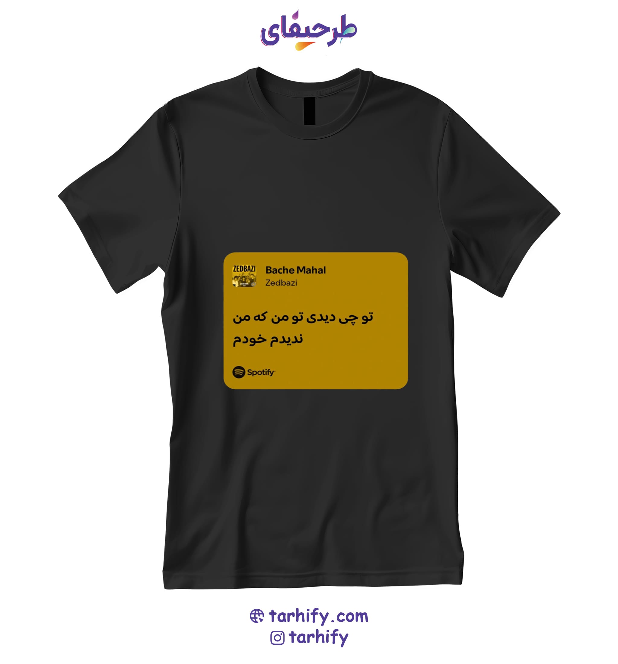تیشرت طرح اسپاتیفای زدبازی با الهام از صفحه پخش Spotify و کاور یکی از ترکهای معروف گروه، تلفیقی از موسیقی خیابانی و طراحی مدرن است. این تیشرت با چاپ دقیق و رنگهای چشمگیر، حالوهوای رپ فارسی و استایل هیپهاپی را منتقل میکند. مناسب برای طرفداران زدبازی، استایل خیابانی و افرادی که عاشق موسیقی و جزئیات هنری هستند.